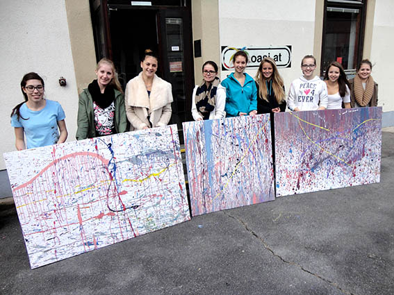 Action-Painting im Atelier! Am 7. Oktober 2014 besuchten die BE-Schülerinnen der 3AHL und 3BHL das Offene Atelier Sierndorf.