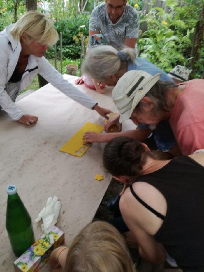 Unter einer kleinen Laube konnten wir aus Wachsplatten Blumen ausstechen, die dann am Weidenholz zu Zauberstäben und Ketten zusammengefügt wurden.