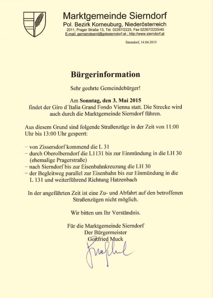 Sierndorf: Neun Gemeinden für den Gran Fondo Vienna Details siehe im Anhang! Datei Bürgerinformation Giro d'Italia Giro d'Italia Radrennen Artikel Zum Verfassen von Kommentaren bitte Anmelden oder Registrieren.