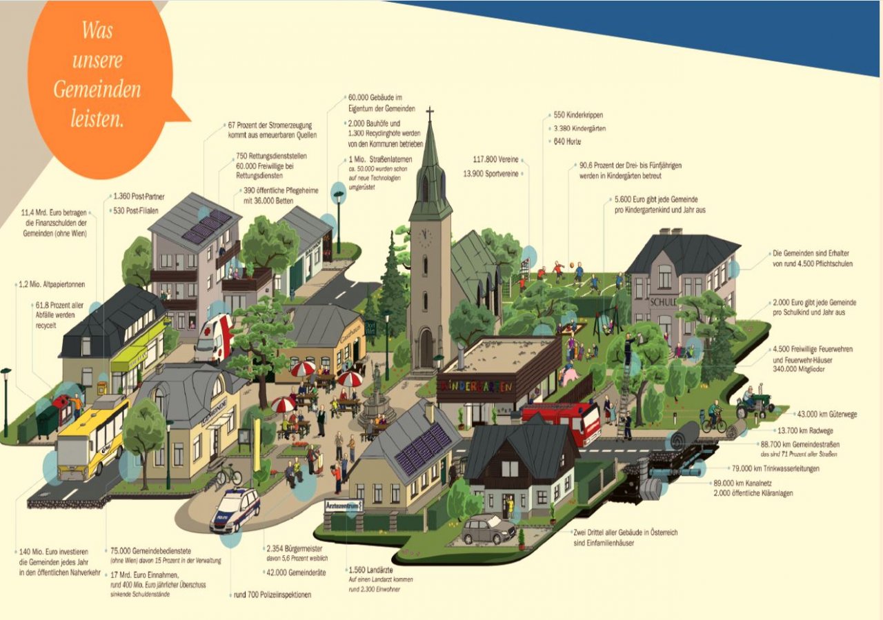 Der Österreichische Gemeindebund hat in einer Grafik zusammengefasst, was unsere Gemeinden ausmacht und was sie alles leisten. Werfen Sie einen Blick darauf, Sie werden überrascht sein, wie vielfältig unsere Arbeit und unsere Dienstleistungen sind.