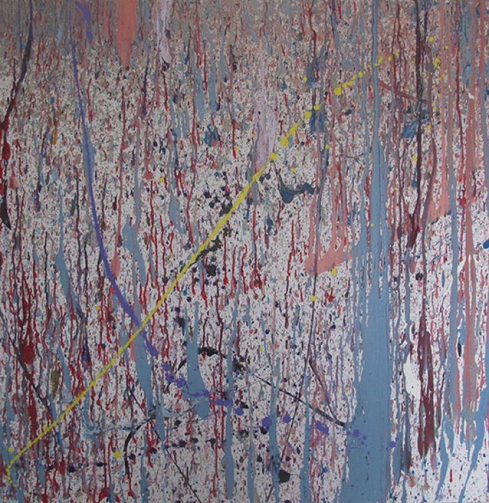 Gezielter Einsatz von Farbe und Schüttschwung in Kombination mit dem zufälligen Fluss der Farbe ergab Bilder, die nun einen Klassenraum in der HLW zieren.
