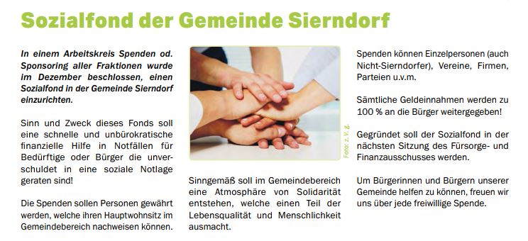 In einem Arbeitskreis Spenden od. Sponsoring aller Fraktionen wurde im Dezember beschlossen, einen Sozialfond in der Gemeinde Sierndorf einzurichten.