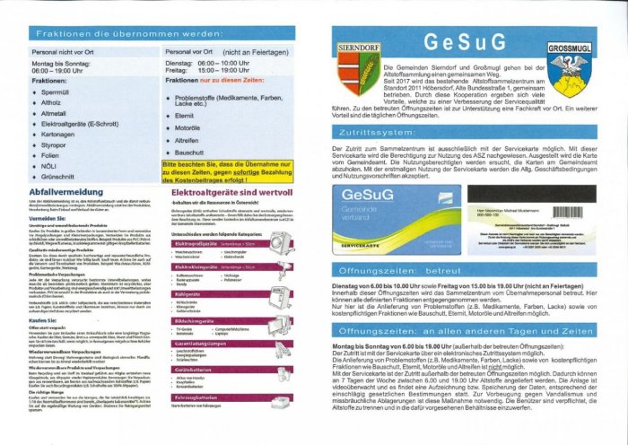 Der Zutritt zum Sammelzentrum ist ausschließlich mit der Servicekarte möglich. Mit dieser Servicekarte wird die Berechtigung zur Nutzung des ASZ nachgewiesen. Ausgestellt wird die Karte vom Gemeindeamt. Die Nutzungsberechtigten wurden mit einem Schreiben gesondert verständigt und ersucht, die Karten am Gemeindeamt abzuholen. Mit der Nutzung der Servicekarte werden die Allg. Geschäftsbedingungen und Nutzungsvorschriften akzeptiert.