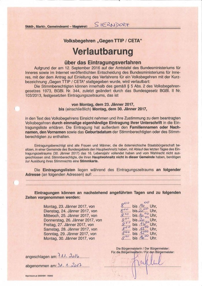 Zwischen 23.Jänner und 30.Jänner 2017 wird das Volksbegehren „Gegen TTIP, CETA und TISA“ stattfinden.