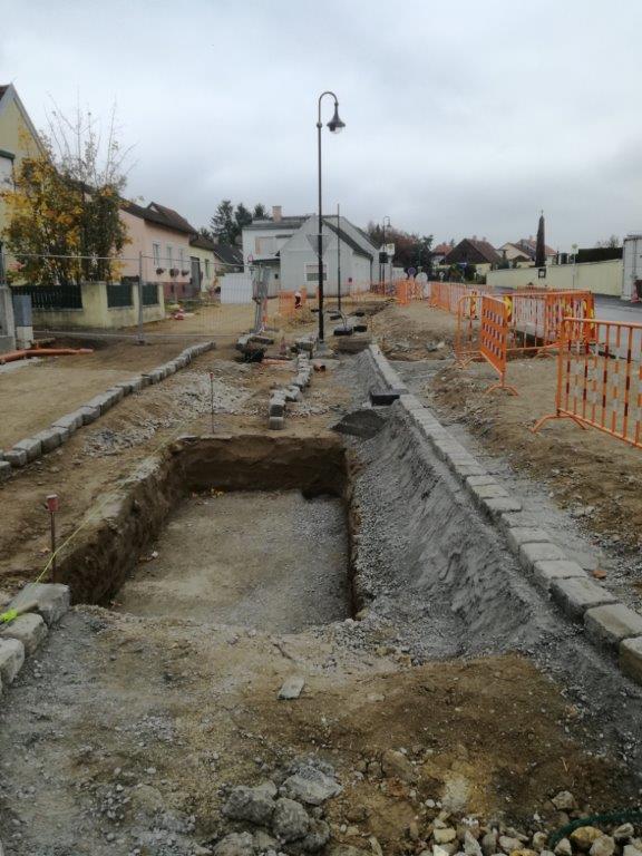 Die Straßenmeisterei Sierndorf arbeitet zügig an der Busbucht und den Nebenanlagen. Die Umrisse sind bereits erkennbar.
