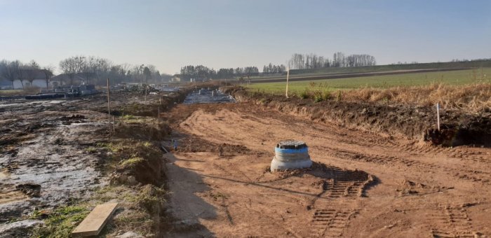 Die Straßenführung für die ersten zwei Bauabschnitte im neuen Siedlungsgebiet sind bereits klar erkennbar. Vor dem aufbringen der Trägerschicht für die Straße wurde Flis eingearbeitet um ein Absinken und Setzungen zu vermeiden. Die provisorische Zufahrt zum Damm wurde wieder entfernt, dass die Ackerflächen wieder bewirtschaftet werden können. Die neue Zufahrt wird über die Dr. Brunnergasse erfolgen.
