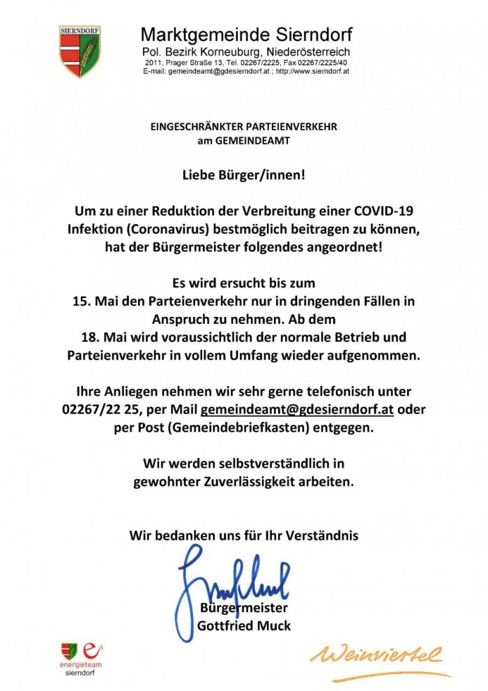 15. Mai den Parteienverkehr nur in dringenden Fällen in Anspruch zu nehmen. Ab dem