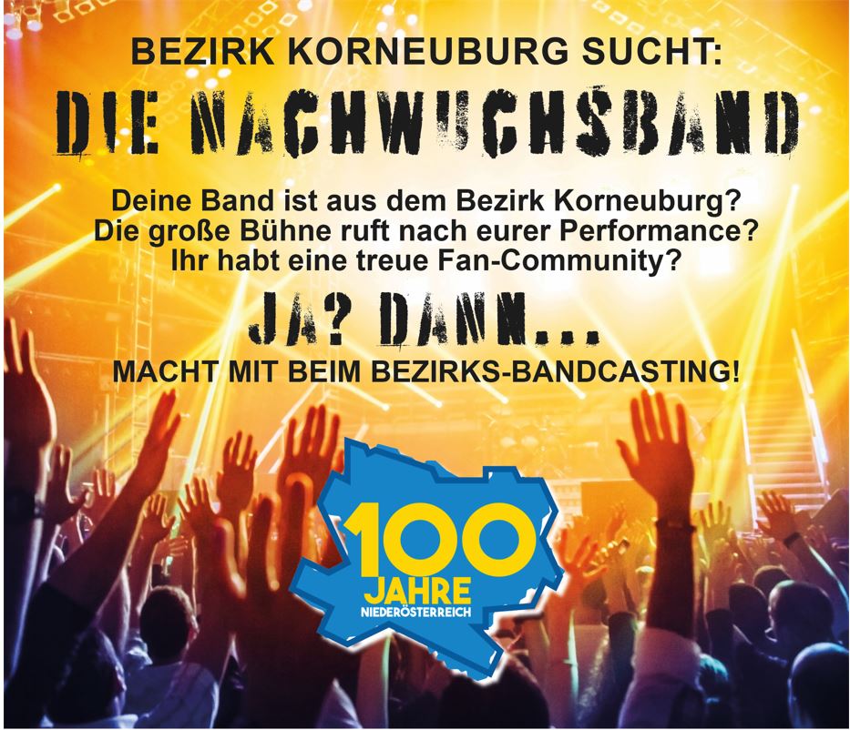 Wir suchen ab sofort DIE BAND, die das Zeug dazu hat, im Rahmen des Bezirksfestes 100-Jahre-NÖ in Korneuburg auf der Hauptbühne zu performen und damit die Partynacht einzuläuten.