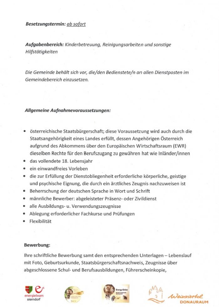 Bei der Marktgemeinde Sierndorf gelangt die Stelle einer/eines Kinderbetreuerin/Kinderbetreuers im Kindergarten Sierndorf.