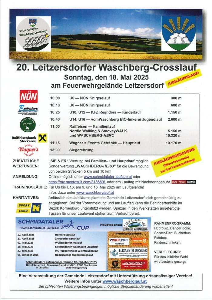Die Gemeinde Leitzersdorf veranstaltet heuer den 20. Leitzersdorfer Waschberg-Crosslauf am 18. Mai 2025!