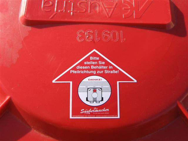 Kommende Woche ist wieder Altpapierabfuhr. Positionieren Sie die Altpapiertonne so, dass der rote Pfeil, der bei der letzten Abfuhr am Deckel angeklebt wurde, Richtung Straße weist. Dies ist notwendig, da die Altpapiertonnen nun mittels eines an der Längsseite des Sammelfahrzeuges befindlichen Greifarmes entleert werden. Dieser Greifarm nimmt die korrekt bereitgestellten Abfallbehälter auf, entleert diese automatisch und positioniert den Behälter wieder in seiner Ausgangsposition.