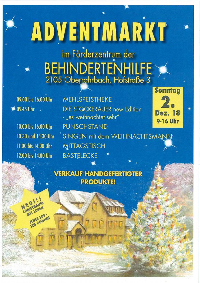 02.12.2018 - 09:00 bis 16:00 Details siehe bitte im Anhang! Datei Adventmarkt Oberrohrbach Bereich Veranstaltungen