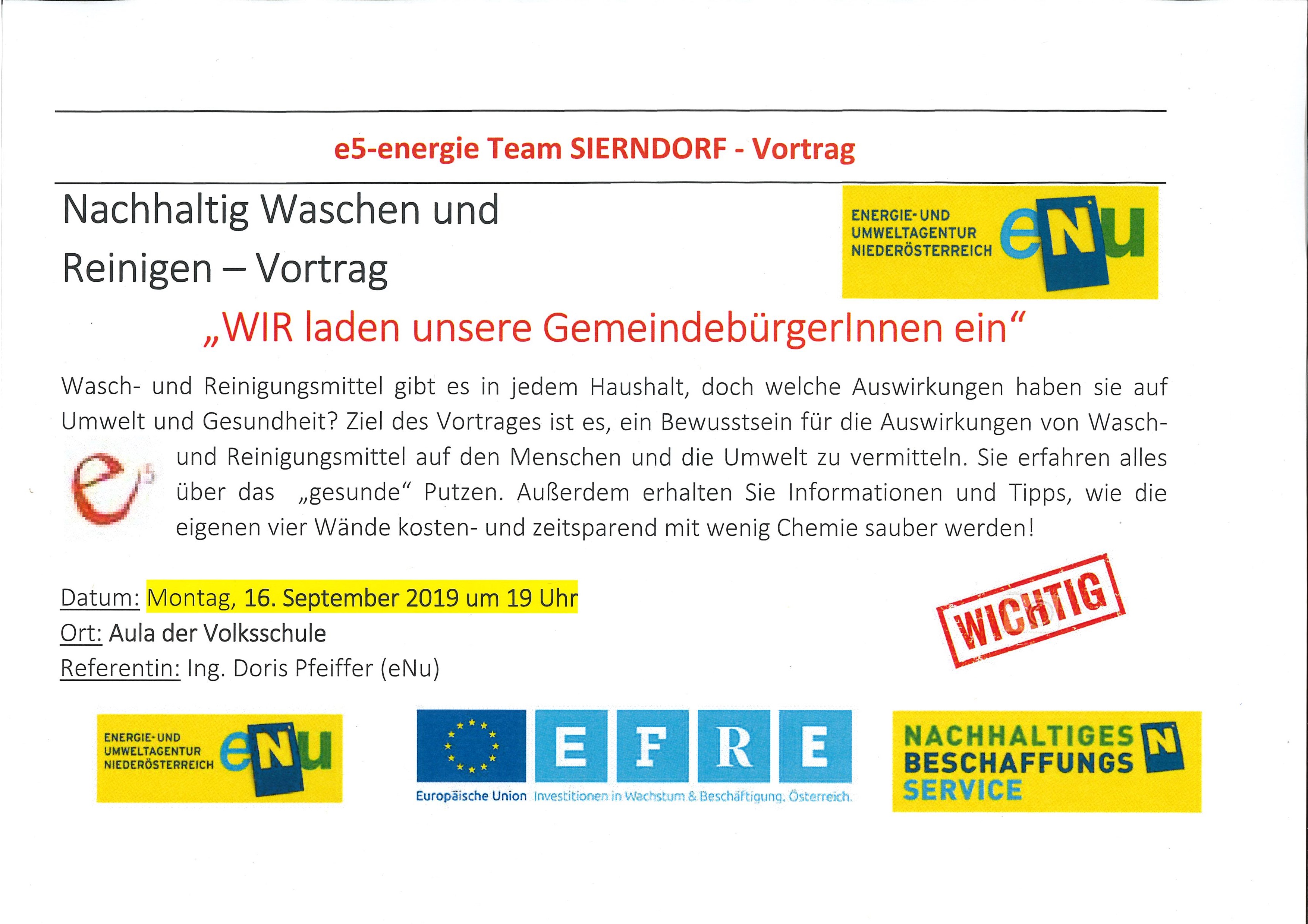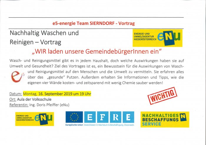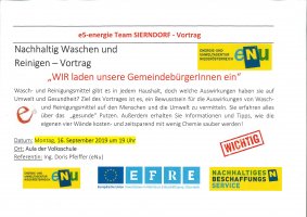 16.09.2019 - 19:00 "WIR laden unsere GemeindebürgerInnen ein" Details siehe bitte im Anhang! Nachhaltig Waschen und Reinigen - Vortrag Datei Nachhaltig Waschen und Reinigen - Vortrag Bereich Veranstaltungen
