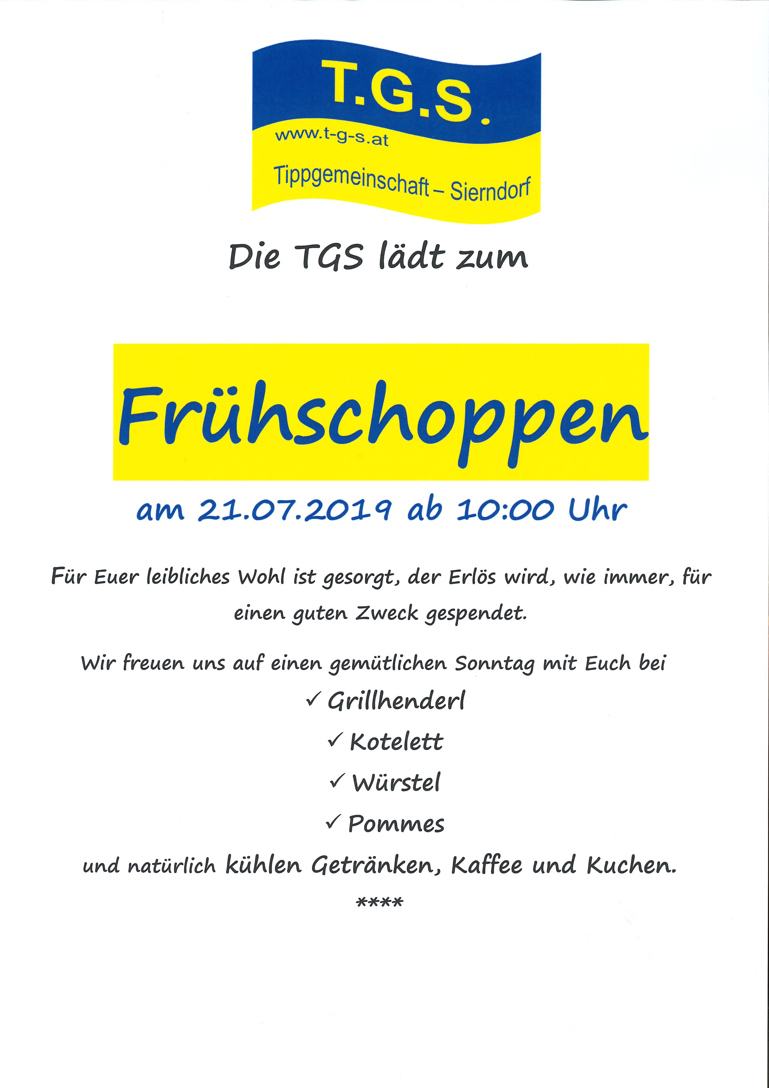 21.07.2019 - 10:00 Näheres siehe bitte im Anhang! Datei T.G.S. Tippgemeinschaft Frühschoppen Bereich Veranstaltungen