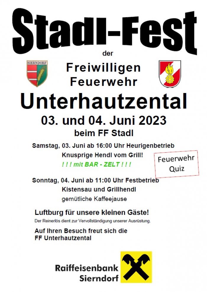 03.06.2023 - 16:00 bis 04.06.2023 - 17:00 Datei Stadl-Fest der Freiwilligen Feuerwehr Unterhautzental Bereich Veranstaltungen