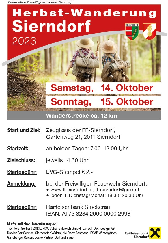 14.08.2023 - 07:00 bis 15.08.2023 - 14:30 Start: FF-Haus Sierndorf Zielschluss: 14.30 Uhr Anmeldung: Feuerwehr Sierndorf