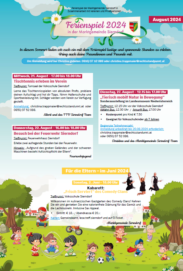17.07.2024 - 17:00 bis 18:00 Ort: Turnsaal der VS Sierndorf. Bitte um Anmeldung - Details siehe bitte in der Anlage. Bereich Veranstaltungen