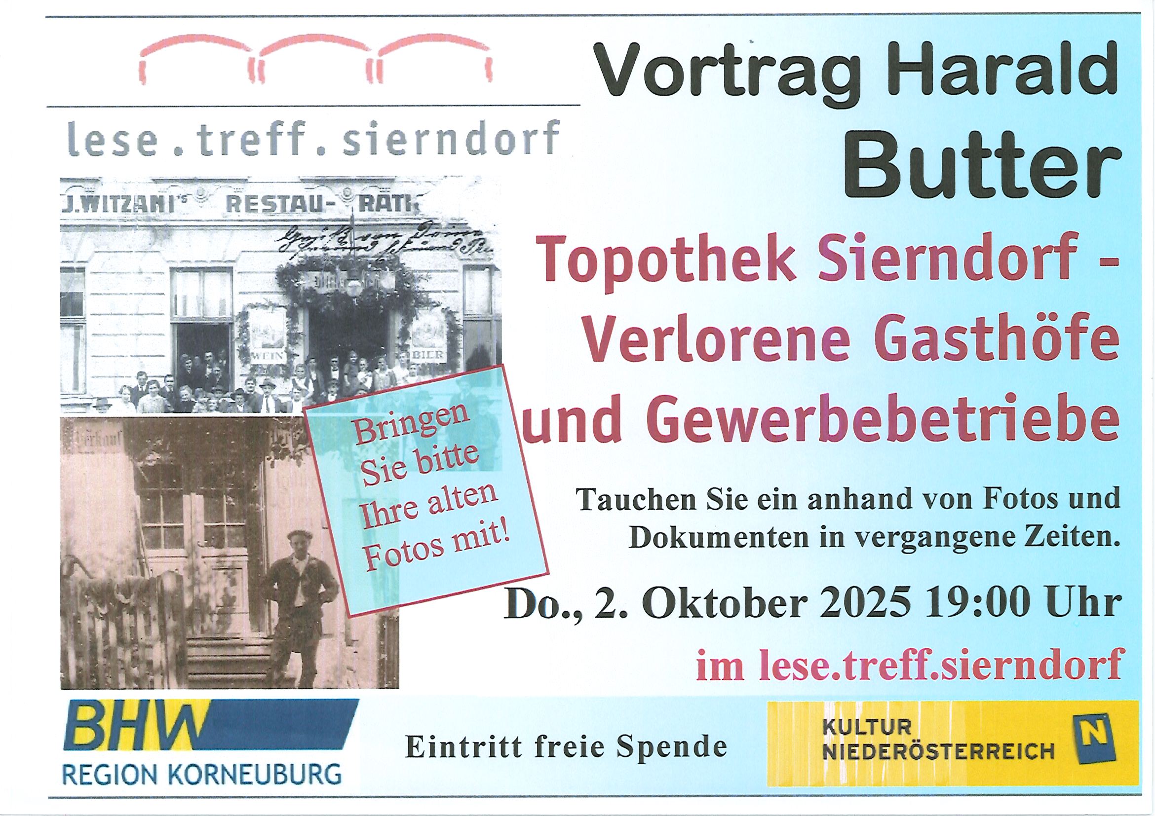 02.10.2025 - 10:15 Ein Vortrag von Herrn Harald Butter im lese.treff.sierndorf Topothek Sierndorf - Verlorene Gasthöfe und Gewerbebetriebe Donnerstag, 2.10.2025, 19:00 Uhr Orte: Sierndorf Bereich Gemeindeamt & Bürgerservice Veranstaltungen