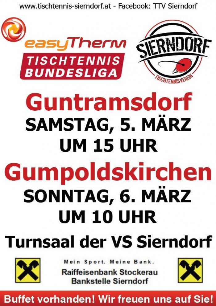 Der TTV Sierndorf mit den Lokalmatadoren Michael Kufmüller und Martin Kinslechner treffen auf die Gegner aus Guntramsdorf am Samstag und Gumpoldskirchen am Sonntag. Somit erwartet Sie ein Niederösterreichderby!