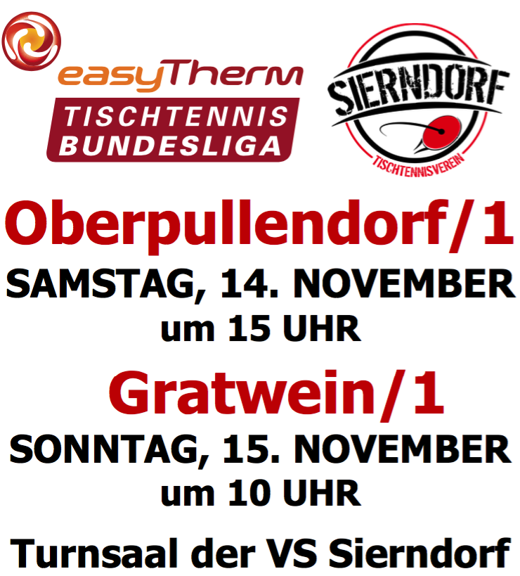 Der Tischtennisverein Sierndorf lädt zum heuer vorletzten Bundesligaspiel in den Turnsaal der Volksschule. Es geht gegen Oberpullendorf aus dem Burgenland um den vorletzten Platz der 2. österreichischen Bundesliga.