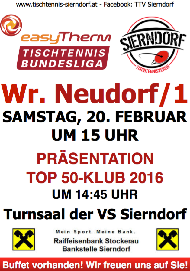 Im ersten Heimspiel der Frühjahrssaison trifft Sierndorf/1 in der 2. Bundesliga auf den Herbstmeister Wiener Neudorf/1 im Turnsaal der Volksschule.