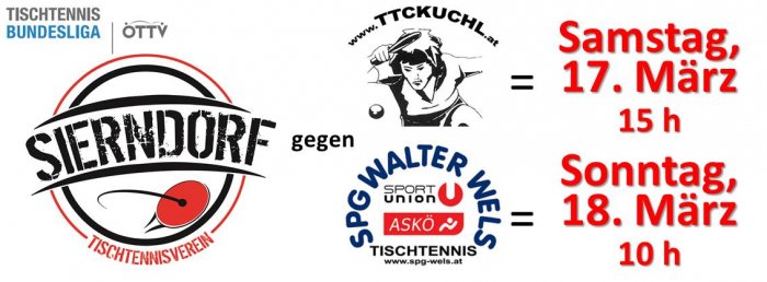 Im Turnsaal der Volksschule Sierndorf empfängt der TTV Sierndorf die Mannschaft des TTC Kuchl in der 2. Bundesliga der Herren. Das Spiel beginnt pünktlich um 15 Uhr.
