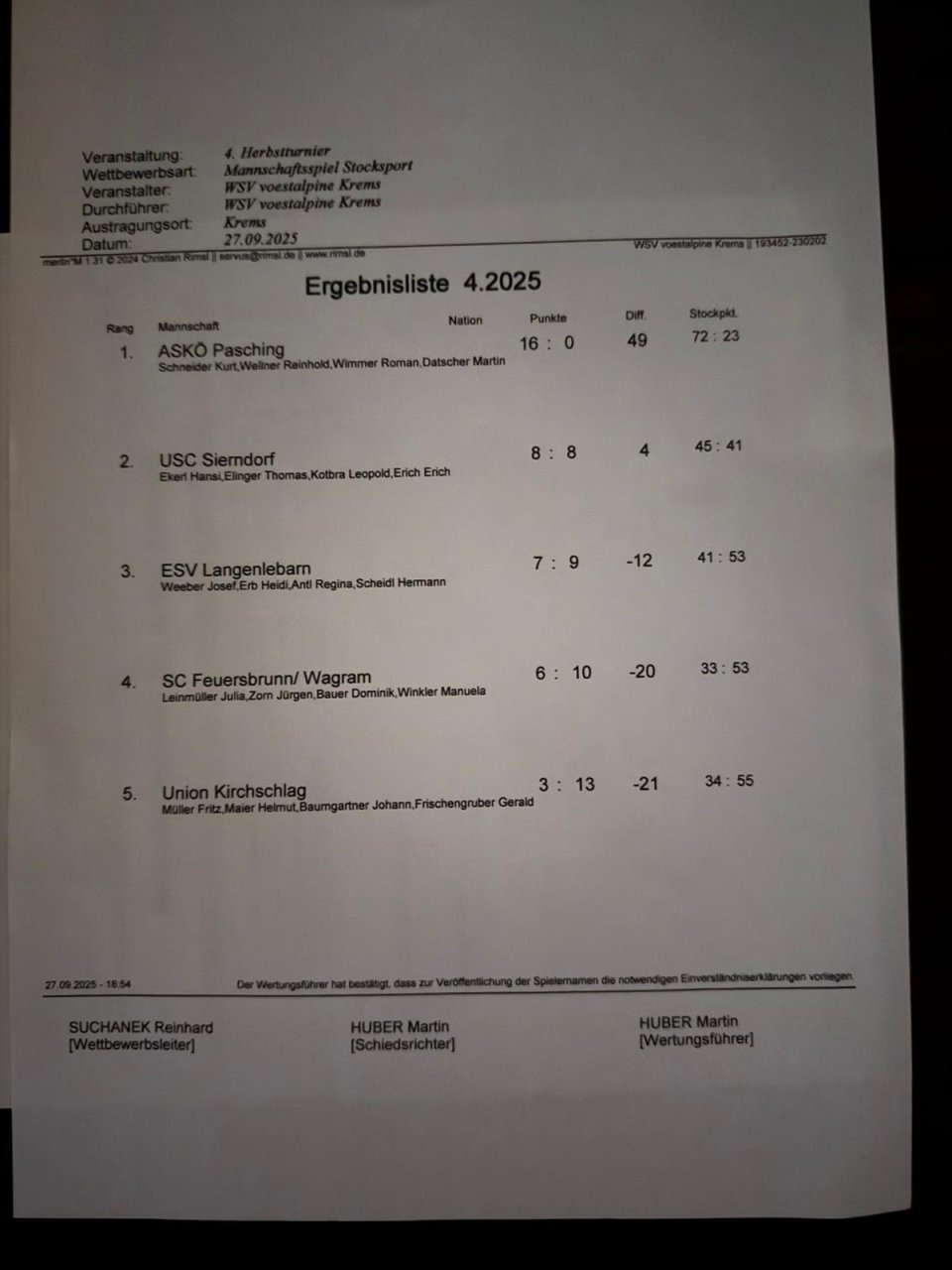 Beim Nachmittagsturnier in Krems konnte der USC Sierndorf den 2 Platz erspielen. In einer Hin - und Rückrunde waren bei 5 Mannschaften, 5 Siege, 3 Niederlagen am Zählerstand, was für Poldi, Erich, Thomas und EJ den guten 2. Platz bedeutete.