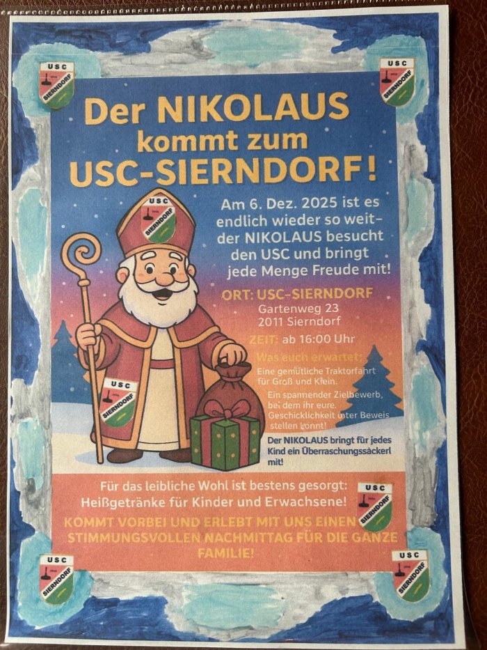06.12.2025 - 16:00 bis 19:00 Heuer besucht uns erstmals am 6. Dezember ab 16.00 Uhr der Nikolaus auf der Stockbahn, Gartenweg 23 2011 Sierndorf Traktorfahren, Nikolosackerl und kleine Schmankerl erwarten Euch. Bereich Veranstaltungen