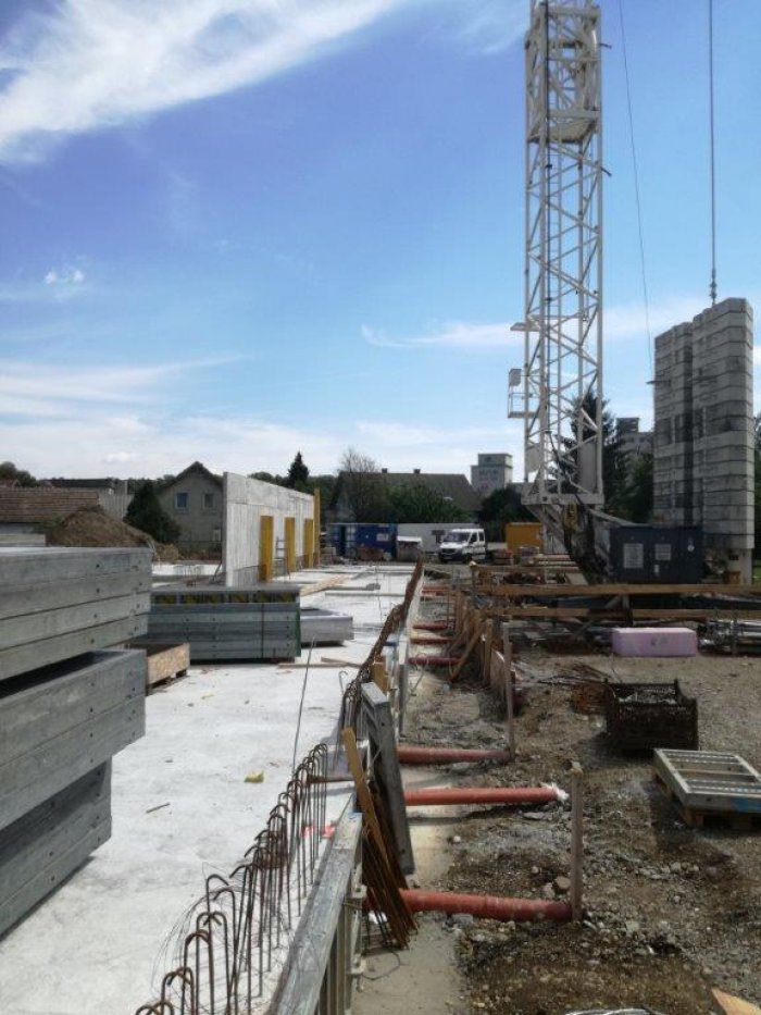 Schallungen werden über Steckeisen platziert und mit Beton ausgegefüllt. Mauer mit Boden wird so zu einer stabilen Verbindung. Alle nötigen Leitungen werden bereits in der Betonwand plaziert.