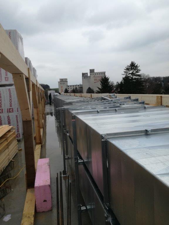 Haupt-Lüftungsstrang soweit montiert. Alle warten auf die Zimmerleut, für die ist die Nässe nicht gut(Isolierung).