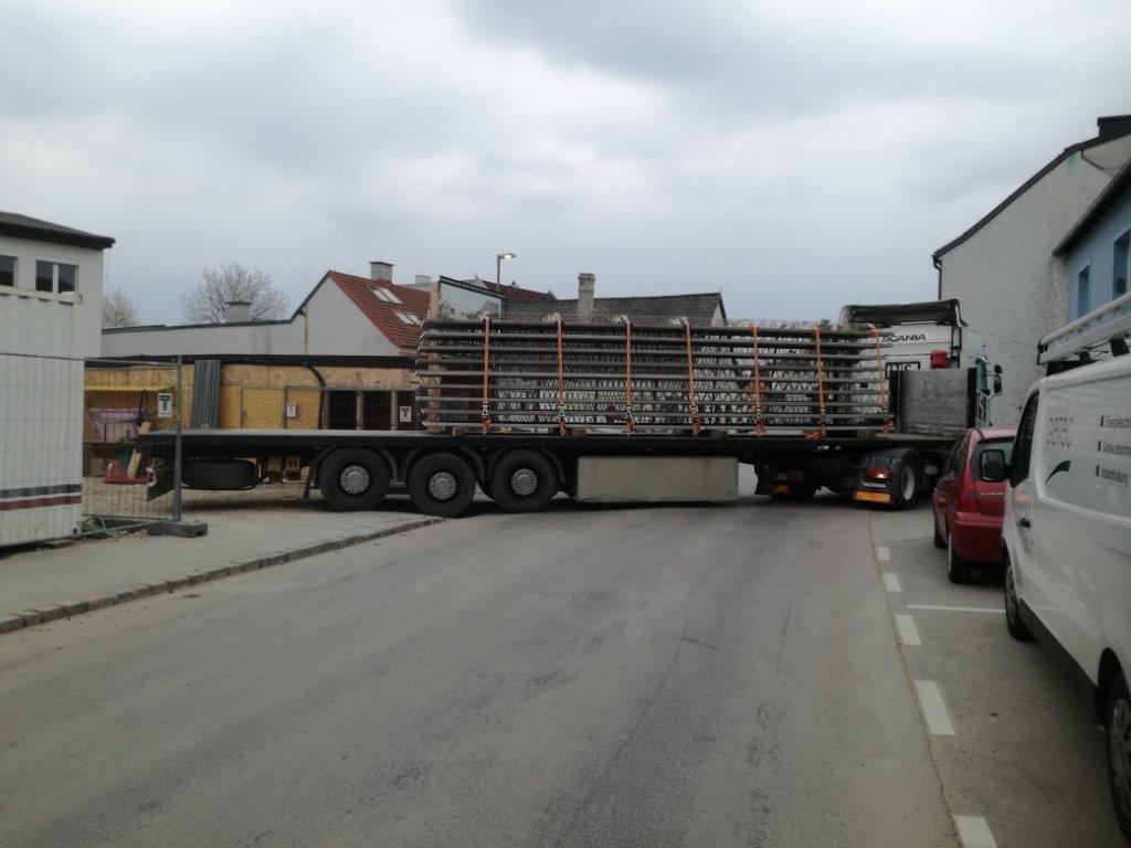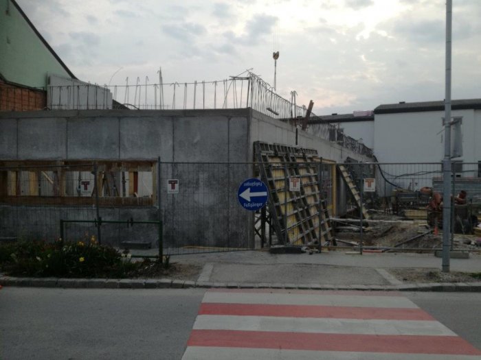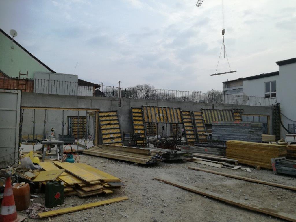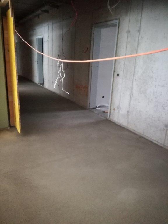 Schalungsteile bei Nachmittagsbetreung werden entfernt - Deck wird mit Fertigbeton Deckenelementen betoniert. Estrichmacher haben bis auf die Aula-Bereiche alles fertig.