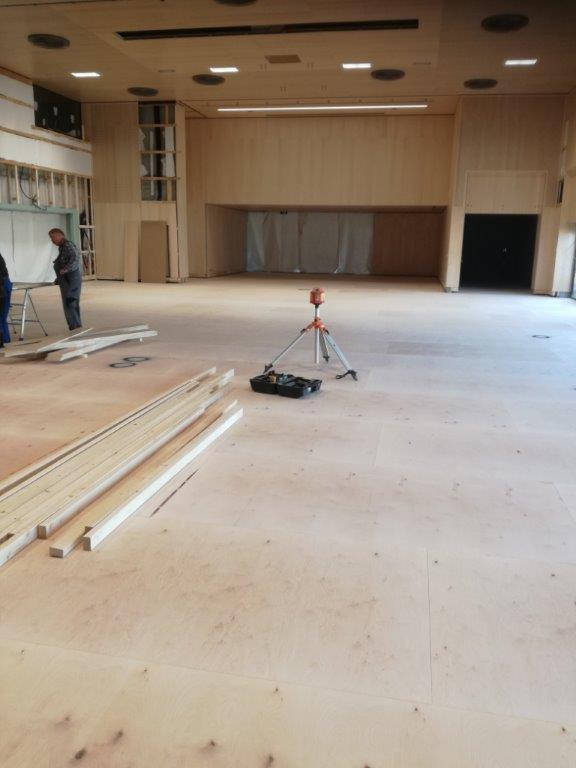 Turnsaal ist der Boden fertig für letzte Schicht eine Art Linoleum. Verkleiden der letzten Wand mit Verblendung, Lino und er wird schon verschlossen.