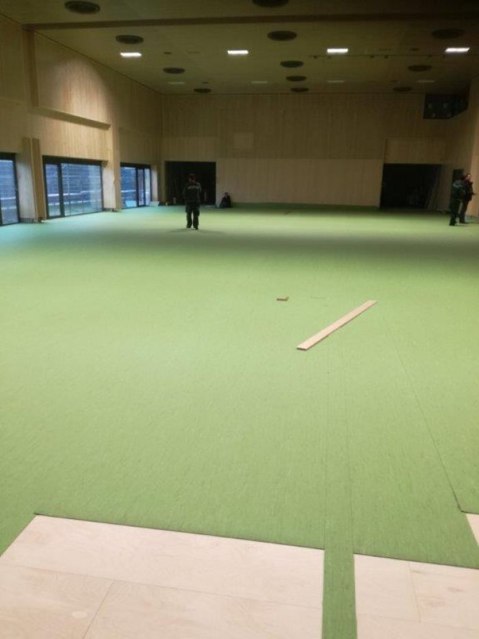 Turnsaal Linoleum Sportboden ist verlegt und verklebt. Das erfrischende Grün kombiniert super mit der Birkenverkleidung. Jetzt fehlen nur mehr Turn-Geräte, Sproßenwände, Leitern, Spielanzeige und der Trenn-Vorhang.