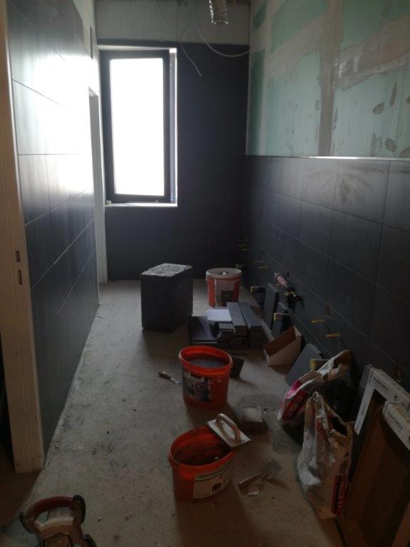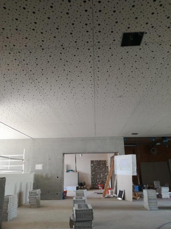 Dachaufbau bis Dachpappe bei Bauteil 3 - als Rohbau fertig. Ansicht Juni von Bauteil 3.Turnsaal fertig, Technik wird noch justiert. Akustikdecken im Gang und Klassenbereich montiert. Serviceklappen und Zusammenstöße werden noch aussilikoniert. Lampen und Leuchten wurden geliefert.