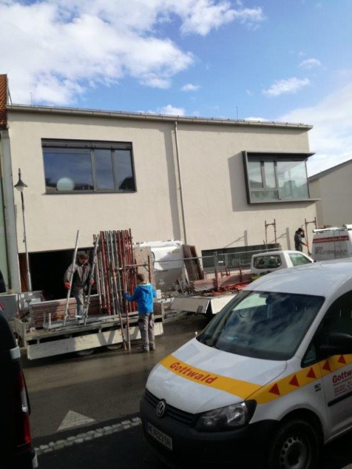 Fertige Fassade in Brauntönen - der Baukörpers wirkt trotz seiner Größe schlicht und elegant. Abbau des Gerüstes im Innenhof/ Eingangsbereich. Versetzen der Baucontainer dass mit der grobe Gestaltung des Schulgartens begonnen werden kann.